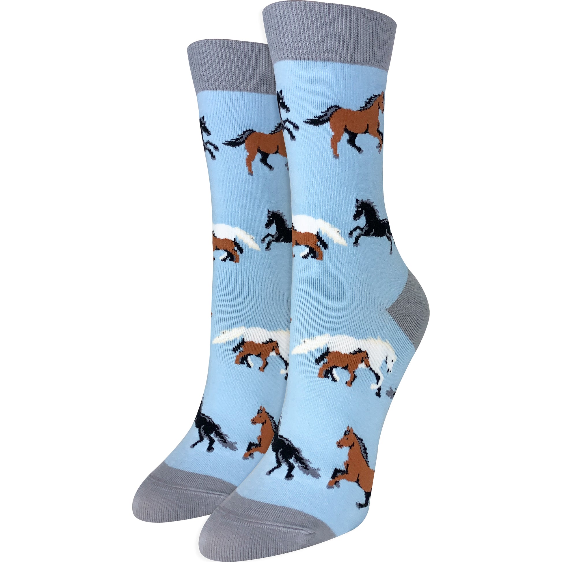 A pair of horse socks for women. A group of wild horses running together is depicted on these horse socks.